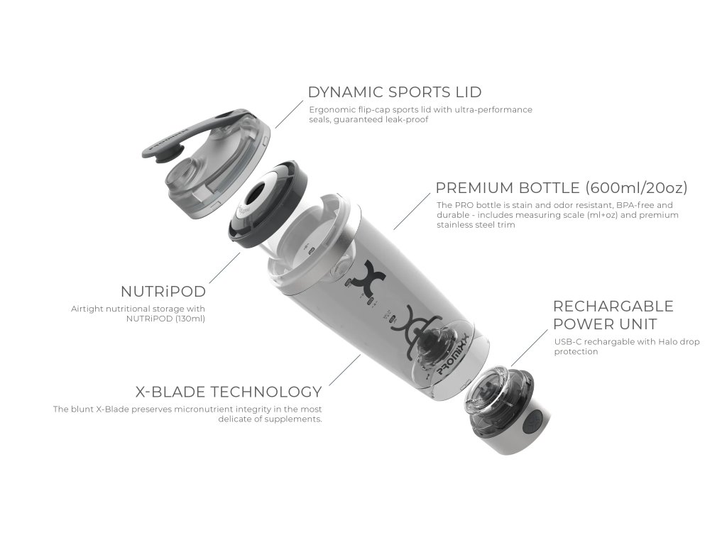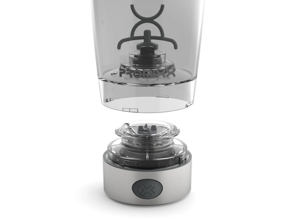 PROMiXX PRO je elektrický šejker s výkonným motorom, dobíjacou lítiovou batériou a NUTRiPODEM na vloženie proteínu. Žiadne trasenie, žiadne hrudky – len dokonale hladký nápoj stlačením jedného tlačidla.
